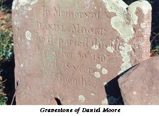Hiram Deats wrote that there are two other burying grounds on this farm near the house but no lettered stones were remembered by older people. When Deats first visited them in the 1930s he saw nothing but field stone markers, with no lettering. Perhaps that is where the earliest Moores are buried.